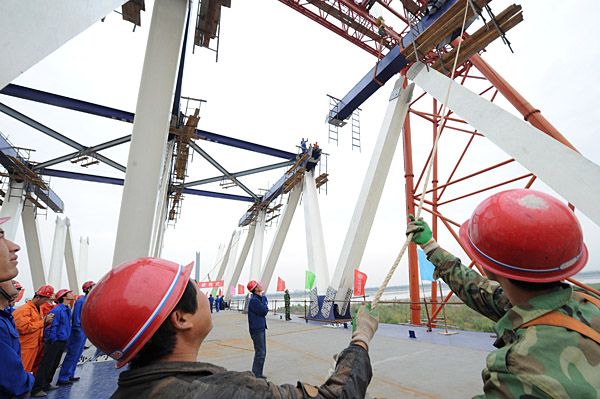| 11月6日,中鐵大橋局的建設(shè)者在鄭州黃河公路鐵路兩用橋上架設(shè)鋼梁。當(dāng)日,鄭州黃河公路鐵路兩用橋開(kāi)始架設(shè)鋼梁,這標(biāo)志著大橋工程的控制性節(jié)點(diǎn)工作全面展開(kāi)。鄭州黃河公路鐵路兩用橋是京廣客運(yùn)專(zhuān)線和公路大橋跨越黃河的共用橋梁,公路鐵路采用上下兩層分布,合建部分全長(zhǎng)9177米,工程將于2010年7月完工。 | |