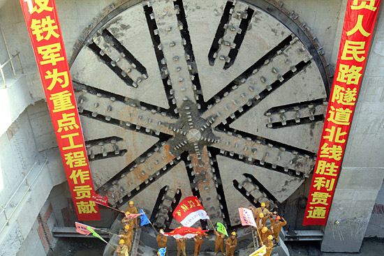 11月9日,上海建工基礎(chǔ)公司的建設(shè)者在人民路隧道浦西接收井慶賀隧道北線(xiàn)貫通。當(dāng)日,2010年上海世博會(huì)配套項(xiàng)目之一的黃浦江又一條越江隧道——人民路隧道江中段北線(xiàn)貫通。人民路隧道全長(zhǎng)3097米,計(jì)劃2009年通車(chē)。新華社發(fā)