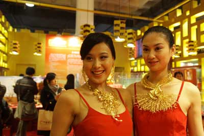 11月11日,模特在展廳內(nèi)展示黃金飾品。 當(dāng)日,由中國(guó)珠寶玉石首飾行業(yè)協(xié)會(huì)和國(guó)土資源部珠寶玉石首飾管理中心聯(lián)合舉辦的“2008中國(guó)國(guó)際珠寶展”在中國(guó)國(guó)際展覽中心開(kāi)幕,來(lái)自12個(gè)國(guó)家和地區(qū)的586家企業(yè)參展。 |