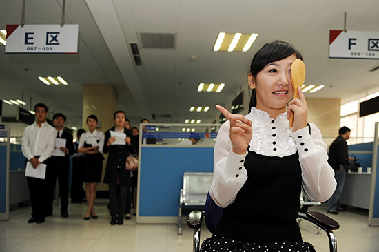 11月7日,山東航空公司在青島人力資源市場招聘95名空乘和空中安全員,吸引了國內逾2000求職者報名,其中不乏眾多為北京奧運會提供禮儀服務的志愿者。據(jù)了解,這是該航空公司首次委托地方專業(yè)人力資源機構招收乘務員。圖為一名女孩在招聘現(xiàn)場接受視力檢查。