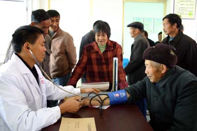 18日,四川省江油市戰(zhàn)旗鎮(zhèn)梨園村愛(ài)心衛(wèi)生站醫(yī)生在為村民量血壓。 當(dāng)日,四川省江油市戰(zhàn)旗鎮(zhèn)梨園村愛(ài)心衛(wèi)生站建成并投入使用,這是四川地震災(zāi)后首個(gè)建成并投入使用的村衛(wèi)生站。據(jù)了解,“5·12”汶川大地震給四川的三級(jí)衛(wèi)生服務(wù)網(wǎng)絡(luò)造成了嚴(yán)重破壞。 |