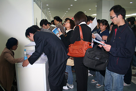 11月20日,上海交通大學2009屆畢業(yè)生國有重點單位專場招聘會現(xiàn)場,5000多名大學生爭取61家國有企業(yè)用人單位職位。受到金融危機牽連,許多應(yīng)屆大學畢業(yè)生把就業(yè)方向從外企轉(zhuǎn)向國企,國企招聘會現(xiàn)場火爆,就業(yè)競爭日益激烈。