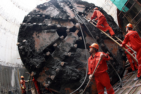 11月25日,隧道工人正在清理盾構(gòu)。 當天,由上海隧道股份自行研發(fā)制造的國產(chǎn)盾構(gòu)順利進入接收井,上海世博電力電纜隧道工程的首個盾構(gòu)區(qū)間勝利貫通。2010年上海世博會舉辦時間正好跨越了整個夏季,對于主辦地上海而言,夏季正是一年之中用電負荷最高的時期。為保障電力供應(yīng),多個與世博會息息相關(guān)的用電工程現(xiàn)正在建設(shè)中。上海世博電力電纜隧道全長15.3公里,同時采用盾構(gòu)法、頂管法和明挖法分段施工。 | |