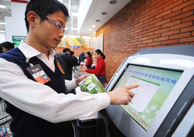 11月30日,超市工作人員在操作蔬菜質(zhì)量追溯系統(tǒng)。 近日,哈爾濱市在沃爾瑪超市啟動蔬菜質(zhì)量安全監(jiān)管追溯系統(tǒng),蔬菜進(jìn)入超市有了“身份證”。消費(fèi)者、執(zhí)法部門通過掃描農(nóng)產(chǎn)品上或產(chǎn)品包裝箱上粘貼的帶有追溯碼的標(biāo)識,或直接將追溯碼輸入超市的蔬菜質(zhì)量追溯系統(tǒng),就可以追溯到認(rèn)證主體,查詢產(chǎn)品生產(chǎn)、質(zhì)量等相關(guān)信息。 |