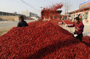 11月30日,在山西襄汾縣趙康鎮(zhèn)趙雄村,兩位村民在辣椒堆中勞作。