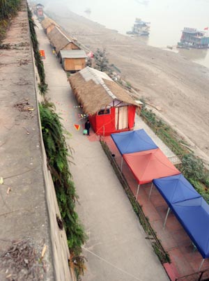 這是在長江防洪堤壩上搭建的茶館和休閑篷。近段時(shí)間以來,位于重慶市九龍坡區(qū)鵝公巖長江大橋北橋頭一側(cè)的堤岸上,一些經(jīng)營者未經(jīng)許可搭建起一批吊腳樓式建筑物作為茶館和休閑場所。這些違章建筑存在嚴(yán)重的安全隱患,而且對(duì)防洪大堤造成了一定的破壞。