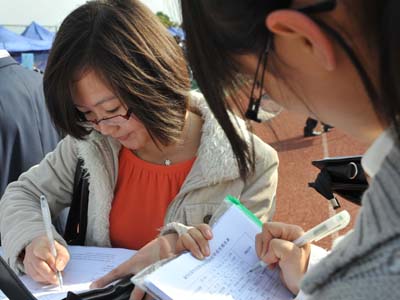 12月4日,高校畢業(yè)生在廣州大學城內(nèi)的招聘會上填寫應聘材料。