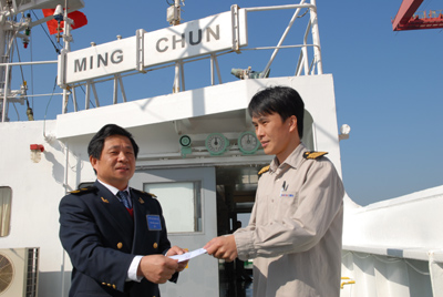 12月17日,廈門海事部門工作人員為“明春”輪船長頒發(fā)入港手續(xù)辦妥通知單。