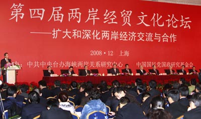 12月21日,第四屆兩岸經(jīng)貿(mào)文化論壇在上海閉幕。中共中央政治局常委、全國政協(xié)主席賈慶林和中國國民黨主席吳伯雄出席閉幕式。