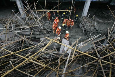 12月21日,消防官兵在現(xiàn)場搶救受傷人員。 當(dāng)日上午10時13分,上海市奉賢區(qū)一在建廠房發(fā)生局部倒塌事故。截至記者發(fā)稿時止,事故已造成1人死亡;另有9人受傷,其中2人傷勢非常嚴(yán)重,生命垂危,已被送往醫(yī)院救治。死傷者均為現(xiàn)場施工工人。