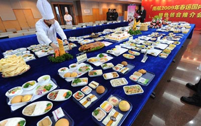 12月25日,一名廚師在擺放航空食品。 當日,南方航空公司舉辦“2009年春運國內(nèi)航線特色餐食推介會”,展示了全國各地十幾個航空食品企業(yè)的上百個各地傳統(tǒng)特色餐食,并將根據(jù)航線地域特點選配航班節(jié)日餐食,營造濃濃“年味”。