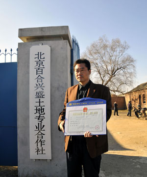 北京出現(xiàn)首家農(nóng)民經(jīng)營(yíng)的“土地銀行”。12月5日,北京市工商局平谷分局向北京百合興盛土地專業(yè)合作社頒發(fā)了“農(nóng)民土地專業(yè)合作社法人營(yíng)業(yè)執(zhí)照”。新華社記者: