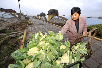 山東搭建平臺(tái)規(guī)范農(nóng)村土地流轉(zhuǎn)。一位菜農(nóng)在西崗鎮(zhèn)申達(dá)農(nóng)業(yè)綜合開發(fā)基地收獲菜花。新華社記者:朱崢