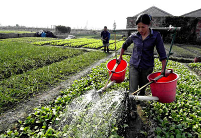 去年3月,浙江省臺(tái)州市路橋區(qū)橫街鎮(zhèn)湖頭村通過(guò)成立天湖土地股份合作社,將農(nóng)民的土地承包經(jīng)營(yíng)權(quán)自愿入股,并對(duì)入股的土地進(jìn)行統(tǒng)一經(jīng)營(yíng)管理,有效盤活了土地。圖為該村農(nóng)民正在給種植的蔬菜進(jìn)行澆水。新華社記者:王小川