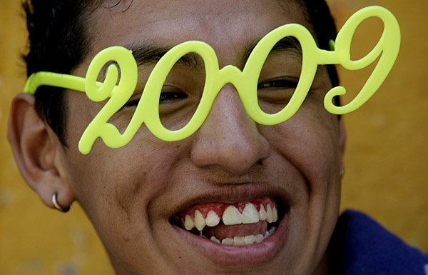 29日,在秘魯首都利馬的一個市場,售賣新年裝飾的小販戴著“2009”字樣的黃色眼鏡。黃顏色在秘魯有新年吉祥的意味,所以黃色的裝飾物在節(jié)慶市場特別走俏。新華社/路透