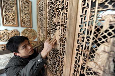 12月30日,楊志強(qiáng)在自己的木雕工作室雕刻屏風(fēng)。在浙江打工學(xué)習(xí)雕刻的楊志強(qiáng)回鄉(xiāng)創(chuàng)辦了寶礪木雕工作室。受全球金融危機(jī)的影響,江西新余市出現(xiàn)大量外出務(wù)工人員返鄉(xiāng)現(xiàn)象。為此,新余市政府迅速采取措施,全力幫助返鄉(xiāng)農(nóng)民工就業(yè)、創(chuàng)業(yè)。