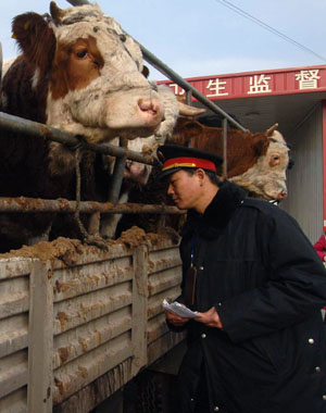 針對(duì)當(dāng)前動(dòng)物疫病高發(fā)季節(jié),北京市采取措施加強(qiáng)動(dòng)物疫病防控,對(duì)外埠進(jìn)京動(dòng)物及其產(chǎn)品實(shí)行嚴(yán)格監(jiān)督檢查,并做好運(yùn)載工具消毒工作。此外,還加強(qiáng)對(duì)禽類(lèi)養(yǎng)殖場(chǎng)、養(yǎng)殖戶(hù)的防疫管理,確保春節(jié)期間上市動(dòng)物及動(dòng)物產(chǎn)品無(wú)疫安全。 1月8日,北京白廟公路動(dòng)物防疫監(jiān)督檢查站的工作人員對(duì)進(jìn)京動(dòng)物進(jìn)行檢查。 |
