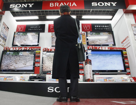 1月13日,一名男子在日本東京的索尼公司柜臺(tái)前駐足!度毡窘(jīng)濟(jì)新聞》網(wǎng)站當(dāng)天援引索尼公司消息人士的話說(shuō),日本電子產(chǎn)業(yè)巨頭索尼公司2008財(cái)年(截至今年3月底)預(yù)計(jì)將出現(xiàn)1000億日元(約合70.65億人民幣)的運(yùn)營(yíng)虧損,這也將是索尼公司14年來(lái)的首次運(yùn)營(yíng)虧損。 |