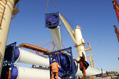 1月14日,一批由中國中材集團公司自主研發(fā)制造的風電設(shè)備從天津港裝船運往印度。據(jù)了解,這批風電設(shè)備共30套,葉片長度達到40.2米,單機容量達到1.5兆瓦。
