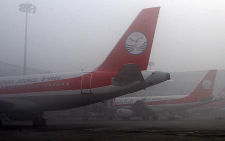 在成都雙流國際機場,幾架飛機在濃霧中等待。