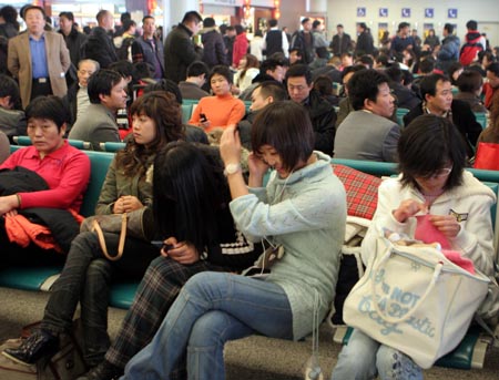 滯留旅客在成都雙流國際機場候機廳內(nèi)等待。