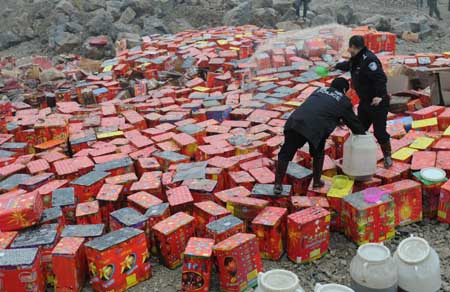 1月20日,公安執(zhí)法人員正在往假冒偽劣煙花爆竹上澆柴油,準(zhǔn)備銷毀。 當(dāng)日,重慶市公安、安監(jiān)、供銷等部門在重慶鋼鐵公司歌樂山采礦場對(duì)5200余件非法煙花爆竹進(jìn)行集中銷毀。