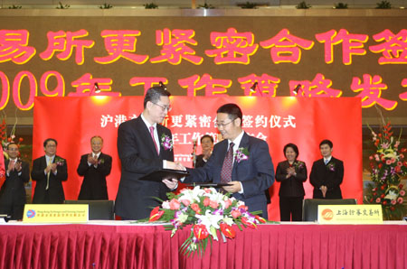 1月21日,上海證券交易所總經(jīng)理張育軍(前右)和香港交易所行政總裁周文耀代表滬港交易所,在上海簽署更緊密合作協(xié)議。 根據(jù)這份協(xié)議,雙方將在信息共享、產(chǎn)品發(fā)展、人員培訓(xùn)等方面開展持續(xù)合作。