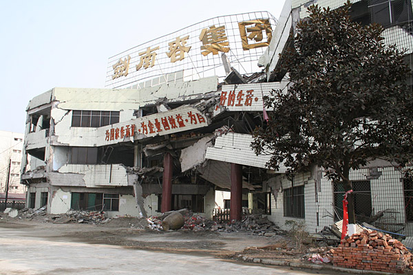 圖為在地震中受損的劍南春集團(tuán)辦公樓(1月21日攝)。 在汶川大地震中,劍南春酒廠遭受重創(chuàng),直接經(jīng)濟(jì)損失近10億元人民幣。受災(zāi)后,企業(yè)全體員工積極開展生產(chǎn)自救。目前,劍南春酒廠釀酒能力已全面恢復(fù),灌裝能力已恢復(fù)到原先的六成。據(jù)悉,劍南春集團(tuán)計劃用兩年時間達(dá)到并超過地震前市場供應(yīng)和銷售收入水平。 | |