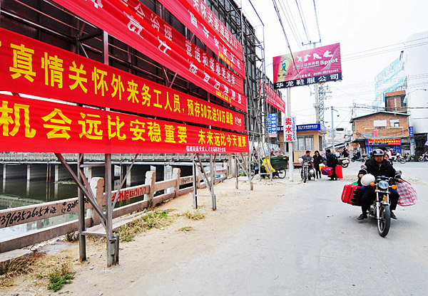 泉州晉江陳埭鎮(zhèn)拉開了節(jié)后用工序幕(2月4日攝)。 2008年下半年以來,民營經(jīng)濟(jì)發(fā)展迅速的福建省泉州市經(jīng)受住金融危機(jī)第一波沖擊,未出現(xiàn)大量企業(yè)倒閉、工人失業(yè)、農(nóng)民工提前返鄉(xiāng)現(xiàn)象,全市150多萬名外來工穩(wěn)定就業(yè)。在泉州市經(jīng)濟(jì)開發(fā)區(qū)、晉江、石獅等民營企業(yè)廠區(qū)集中地,企業(yè)招聘廣告隨處可見,熟練工人、普工、技術(shù)人員成為受企業(yè)青睞的對(duì)象。 | |