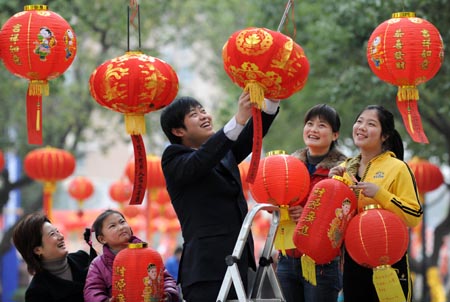 2月8日,合肥市綠苑社區(qū)居民懸掛寫有節(jié)日祝福的燈籠。當日,安徽省合肥市綠苑社區(qū)群眾齊聚一堂,人們用寫有節(jié)日祝福語的元宵燈籠裝點社區(qū),有才藝的居民還在社區(qū)元宵喜樂會上表演節(jié)目,共迎元宵佳節(jié)。