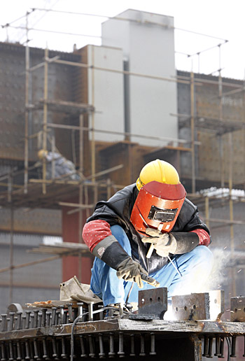 2月9日,一名工人在京滬高鐵上海虹橋站工地焊接地下鋼梁。春節(jié)假日期間,千里京滬高速鐵路建設(shè)工地,依然是一派熱火朝天的施工景象。京滬高速鐵路全線開工以來,取得的成績超過預(yù)期,開局之年各項建設(shè)任務(wù)目標(biāo)均如期順利完成。