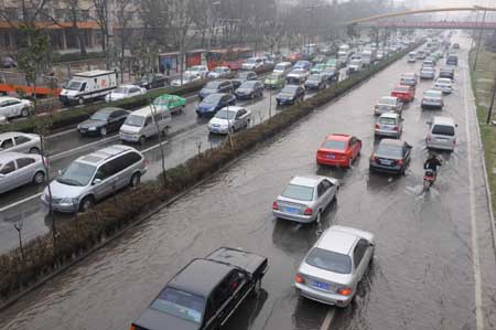 2月18日晨,由于自來水主管道輸水聯(lián)絡(luò)線爆裂,陜西省西安市南二環(huán)長安大學(xué)路段汪洋一片,造成交通擁堵。自來水公司管網(wǎng)搶修人員快速趕到現(xiàn)場進行搶修,該路段交通于上午9時左右恢復(fù)正常。圖為車輛在西安市南二環(huán)長安大學(xué)附近路段涉水前行。