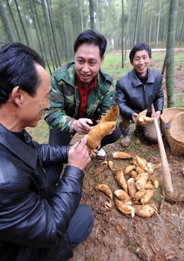 2月24日,陳永華(中)與當(dāng)?shù)剞r(nóng)民一道在竹林中挖采竹筍。 曾在南開大學(xué)獲得世界經(jīng)濟學(xué)博士學(xué)位的陳永華,2005年放棄在天津市一家證券公司總監(jiān)的職位,回到家鄉(xiāng)安徽省廣德縣投身現(xiàn)代農(nóng)業(yè),創(chuàng)辦了潤華生態(tài)林業(yè)公司,建成了1.5萬畝優(yōu)質(zhì)高效豐產(chǎn)竹林。陳永華組織林農(nóng)在竹林間栽培竹蓀、套種山芋、套養(yǎng)竹林雞、投建竹筍加工廠,發(fā)展竹林經(jīng)濟,為當(dāng)?shù)剞r(nóng)民提供固定就業(yè)崗位150個,季節(jié)性用工最多時每天達到上千人,每年為農(nóng)民提供山場租賃費和勞務(wù)收入1000萬元。 |