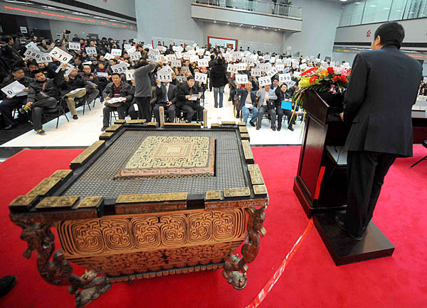 3月8日,“2008北京第29屆奧運會開幕式演出道具‘缶’專場拍賣會”在北京產(chǎn)權(quán)交易所落槌。首個標(biāo)的共十個缶以1.3萬元總價起拍,經(jīng)過近百輪激烈競價,最終以70.6萬元被347號買家競得。據(jù)介紹,當(dāng)日有1000只缶約53個標(biāo)的投入競拍,共有439家單位和個人報名參與了現(xiàn)場競買。