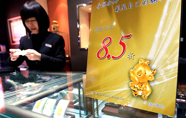 3月10日,上海市的一家金飾品店在柜臺上擺出調(diào)價標簽。當(dāng)日,上海黃金行業(yè)協(xié)會發(fā)布信息,從3月10日起,上海黃金飾品市場價從每克271元降至262元,紀念型金條的市場價從每克259元降到252元。信息顯示,上海的黃金飾品價格已低于香港。