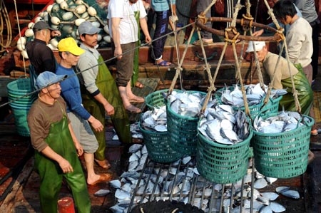 3月18日,在福建省東山縣海峽兩岸水產(chǎn)品加工集散基地配套的漁港碼頭,捕魚歸來的船工將海魚裝吊上岸。東山海峽兩岸水產(chǎn)品加工集散基地2007年設立,現(xiàn)已投產(chǎn)企業(yè)8家,在建4家,目前已完成投資1.5億元。