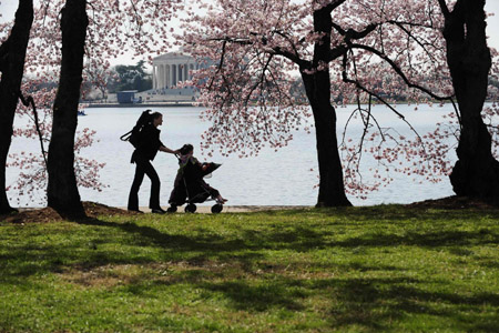 3月31日,游人在美國(guó)首都華盛頓蓄潮湖邊欣賞櫻花。今年的華盛頓櫻花節(jié)于3月28日至4月12日間舉行,預(yù)計(jì)將于4月1日至4日迎來(lái)櫻花盛開(kāi)高峰。