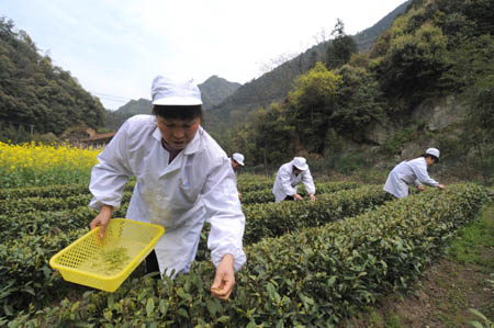 4月2日,茶廠工人正在采摘新茶。浙江省建德市農(nóng)業(yè)、質(zhì)監(jiān)等相關(guān)部門近幾年大力發(fā)展當?shù)貍鹘y(tǒng)的“建德苞茶”,引導(dǎo)茶農(nóng)規(guī);N植并推進茶文化品牌建設(shè),使該茶獲得“中國文化名茶”稱號,為當?shù)剞r(nóng)村經(jīng)濟發(fā)展和農(nóng)民增收起到了促進作用。