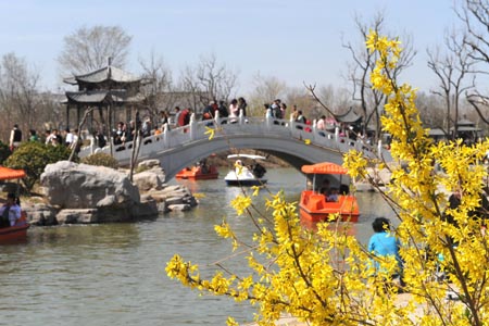4月6日,在天津長(zhǎng)虹公園,小橋流水的美景吸引了眾多游人。當(dāng)日,天津最高氣溫達(dá)26攝氏度,市民紛紛來(lái)到戶(hù)外享受春色。新華社記者:馬平 攝