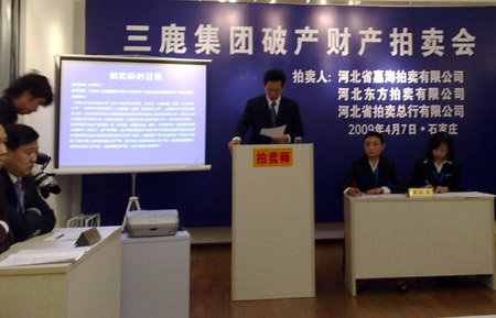 這是三鹿第二批破產(chǎn)財產(chǎn)拍賣會現(xiàn)場(4月7日攝)。當日,石家莊三鹿集團股份有限公司第二批破產(chǎn)財產(chǎn)在河北省嘉海拍賣有限公司進行了拍賣,河北貝蘭德乳業(yè)有限公司和石家莊君樂寶乳業(yè)有限公司成功回購了原屬三鹿的股權。