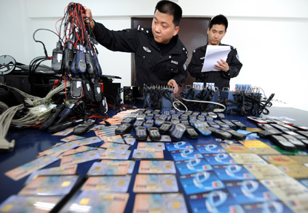 4月8日,南京市公安局浦口分局的民警在清點(diǎn)繳獲的大量手機(jī)及銀行卡。 近日,南京警方破獲一起利用手機(jī)短信騙取受害人銀行卡存款的案件,抓獲犯罪嫌疑人3名,繳獲作案用的短信群發(fā)器3組、電腦主機(jī)3臺(tái)、涉案銀行卡100余張、作案用手機(jī)200余部。