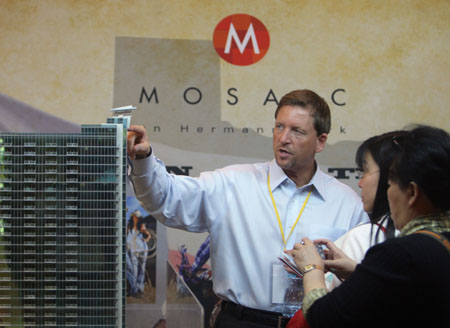 4月12日,來自美國馬賽克公司的經(jīng)銷總經(jīng)理托馬斯(左)在向中國消費(fèi)者介紹他們的房子。4月10日至12日,美中房地產(chǎn)展示交易會(huì)在北京召開,該交易會(huì)由美中貿(mào)易發(fā)展協(xié)會(huì)等單位組織,70多家美國開發(fā)商和中介機(jī)構(gòu)參加交易會(huì)。據(jù)主辦方預(yù)計(jì)在3天時(shí)間內(nèi),會(huì)有500多套住宅意向成交。