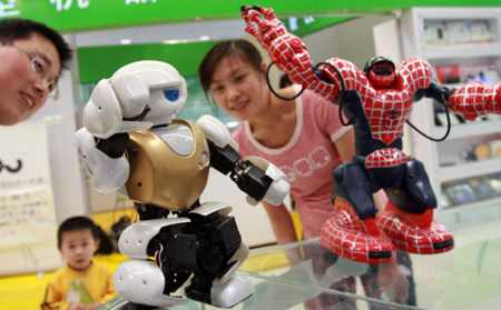 4月19日,顧客在北京中關(guān)村的機器人專營店內(nèi)觀賞機器人。近日,一家機器人專營店在北京中關(guān)村鼎好電子商城開業(yè)。該店匯集了國內(nèi)外娛樂、保潔、家用及教學(xué)四大類的實用型機器人近百個品種,吸引了眾多顧客駐足觀看。