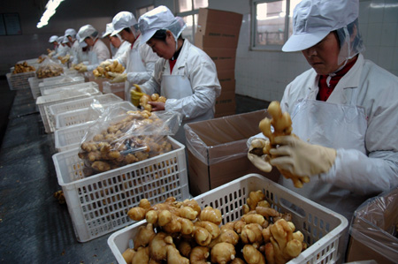 4月22日,在山東省日照市的一個生姜加工車間內(nèi),工人們在加工生姜。 日照生姜曾因不符合要求于2006年終止出口日本。近幾年,當(dāng)?shù)赝ㄟ^實施基地建設(shè)、農(nóng)資統(tǒng)一配送、科學(xué)儲存等措施,生姜達(dá)到出口要求,近日恢復(fù)了對日本出口。