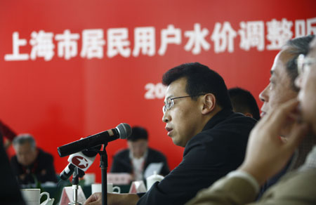 4月27日,一名與會者在聽證會上發(fā)言。當(dāng)日,上海市社會發(fā)展委員會舉行居民用戶水價調(diào)整聽證會,就兩套調(diào)價方案征求社會各方意見,這是上海時隔7年再次針對居民生活用水價格調(diào)整進行聽證。目前上海自來水綜合水價為每立方米1.84元,而全國36個大中城市綜合水價的平均值為3.77元。