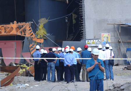 5月19日,事故調(diào)查人員在現(xiàn)場了解情況。 5月18日20時(shí)15分,天津市臨港工業(yè)區(qū)渤化永利熱電有限公司在進(jìn)行煙囪內(nèi)筒安裝作業(yè)時(shí),發(fā)生煙囪內(nèi)筒墜落,造成一起重大安全生產(chǎn)事故,導(dǎo)致現(xiàn)場施工人員12人死亡、11人受傷。事故原因正在調(diào)查中。