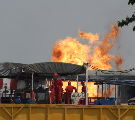 5月20日,四川德陽旌陽區(qū)德新鎮(zhèn)新場(chǎng)氣田事故氣井正在燃燒。5月19日19時(shí)許,四川德陽旌陽區(qū)德新鎮(zhèn)新場(chǎng)氣田一正在建設(shè)中的氣井發(fā)生井噴事故,當(dāng)?shù)卣杆偈枭⒘酥車幼〉娜罕姟?0日凌晨5時(shí)05分,在消防官兵和新場(chǎng)氣田搶險(xiǎn)人員的配合下,事故氣井被成功封住,5時(shí)15分成功點(diǎn)火。目前,燃燒仍在持續(xù),當(dāng)?shù)鼐旌拖拦俦诂F(xiàn)場(chǎng)進(jìn)行保衛(wèi),被疏散的群眾已經(jīng)回家。事故未造成人員傷亡。
