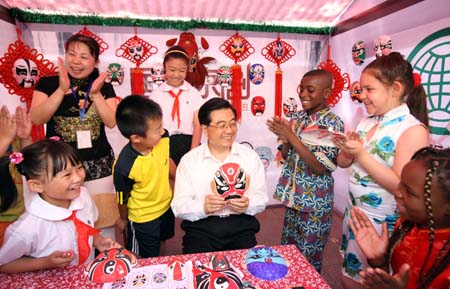 在“六一”國際兒童節(jié)到來之際,5月31日,中共中央總書記、國家主席、中央軍委主席胡錦濤來到北京市朝陽區(qū)芳草地國際學(xué)校,親切看望中外小朋友們。這是胡錦濤同中外小學(xué)生一起畫京劇臉譜。
