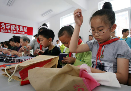 6月5日是世界環(huán)境日,6月4日,江蘇省南通市虹橋第二小學(xué)把學(xué)生社會(huì)實(shí)踐課引入社區(qū),學(xué)生與社區(qū)居民一起用廢舊紙板、碎布制作環(huán)保袋,倡導(dǎo)保護(hù)環(huán)境,減少白色污染。 新華社發(fā)