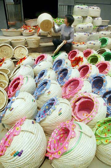 6月7日,山東省郯城縣馬頭鎮(zhèn)農(nóng)民在晾曬“秸稈工藝品”。該鎮(zhèn)農(nóng)民把小麥秸稈、玉米皮等晾曬消毒后加工成“秸稈工藝品”,出口歐美及東南亞各國(guó),既避免了秸稈焚燒造成的環(huán)境污染,又可為當(dāng)?shù)剞r(nóng)民增收。 新華社發(fā)